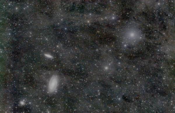 - Der graue Hintergund ist der 'Intergalaktische Flux', Staubgebiete die von den Sternen der Milchstrasse beleuchtet werden.