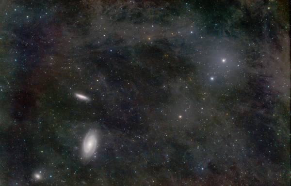 - Der graue Hintergund ist der 'Intergalaktische Flux', Staubgebiete die von den Sternen der Milchstrasse beleuchtet werden.